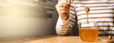 Woman with honey and dipper at wooden table, closeup view with space for text. banner design