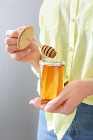 Woman with glass of sweet honey on gray background
