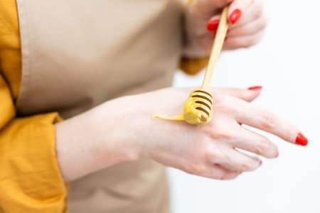 Closeup on young woman with honey on hand on white background