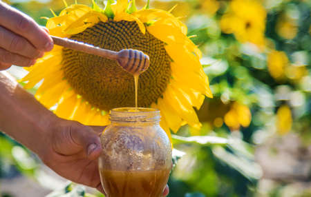 Sunflower flowers honey in hands. Selective focus. Nature.