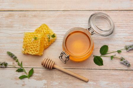 Fresh honey, honeycomb and honey dipper on wooden table with mint sprigs, creating a sweet and natural background