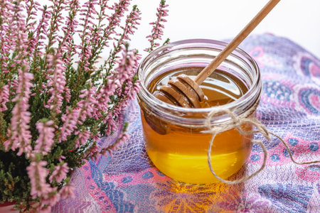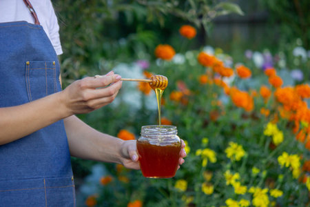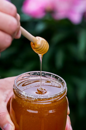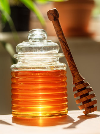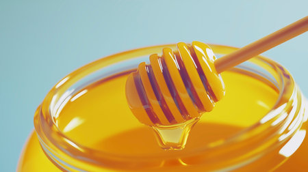 A captivating closeup of golden honey in a jar, perfect for culinary uses and showing health benefits