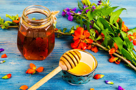 fresh honey dripping from a spoon into a plate on a blue background. organic vitamin health food