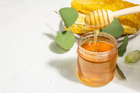 Honey dripping from a wooden honey dipper into a glass jar on white marble background