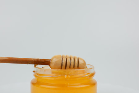 Natural organic honey in glass jar, wooden dripper spoon near it isolated on table.