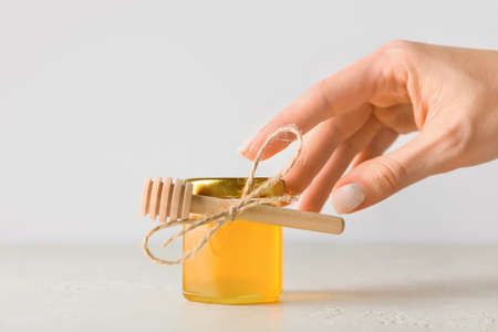 A jar of fresh honey with a wooden honey spoon on a white wooden background. Sweet sticky healthy product.
