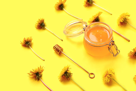 Organic floral honey, in jars, with pollen and honey combs, with wildflowers creative layout bright yellow background top view copy space banner format