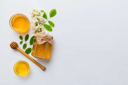 honey jar with acacia flowers and leaves. fresh honey top view flat lay.