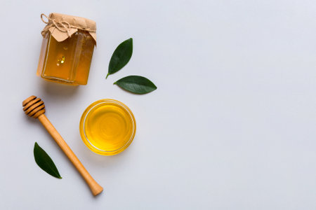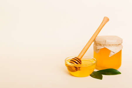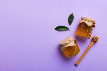 Honey in jar with leaves and honey dipper on colored background top view with copy text.