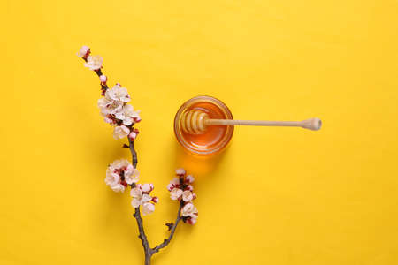 Honey Bee jar with wooden spoon and beautiful white flowering branches on yellow background. springtime concept