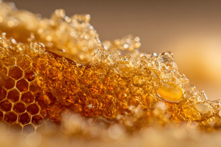 A stunning close-up shot capturing glistening honey droplets resting on a bee hive comb, showcasing vibrant amber hues and beautiful bokeh.