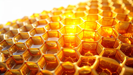 Stunning golden honeycomb structure with intricate textures and glimmers of light; perfect for abstract backgrounds or nature-themed designs that inspire warmth and elegance.