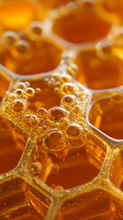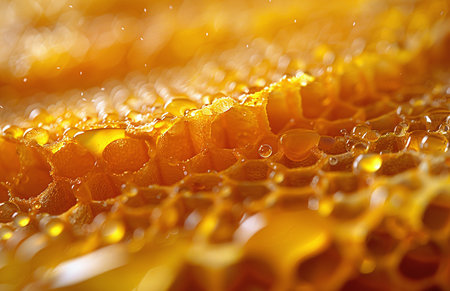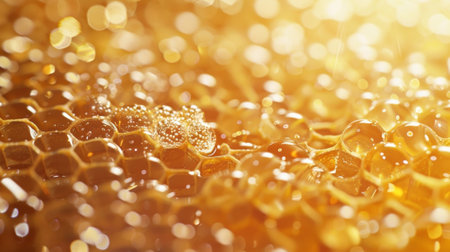 This stunning close-up captures the beauty of a honeycomb texture filled with glistening droplets. The warm golden tones create a natural and inviting atmosphere, perfect for conveying freshness and sweetness.