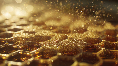 A creative digital illustration depicting Commercial creative design of honeycomb dew drop texture background in golden cells with water beads, fresh morning light, organic sweet appeal. This AI-generated artwork features unique visual elements suitable for various commercial and editorial applications. AI-generated illustration.