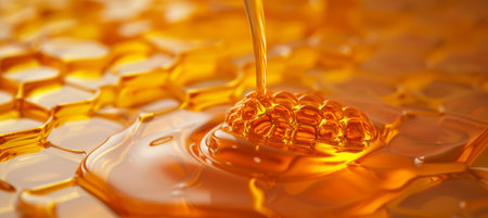 A closeup macro shot captures the rich, viscous texture of pure, golden honey as it slowly drips from a natural honeycomb.