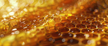 Exploring the intricate texture of honeycomb and golden honey in hexagonal formations