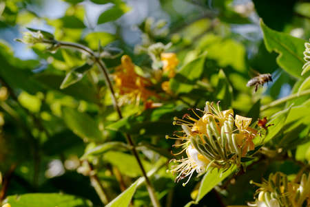 Blooming Honeysuckles (Lonicera Caprifolium). Natural spring background with flowers in sunny day.