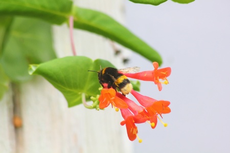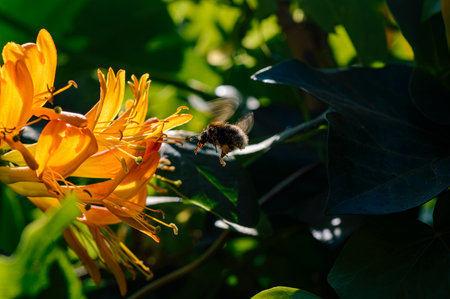 Image of a bumblebee flying to the flowers of a honeysuckle plant