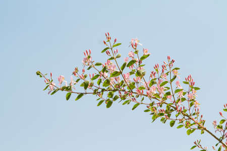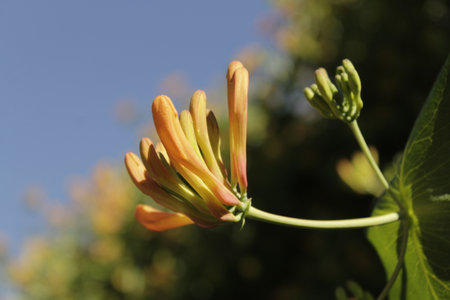 Flowers and nature in the morning Still bright This flower is Lonicera caprifolium, the sky is clear. High quality photo