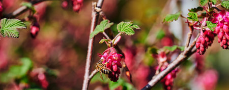 Bee at a flowering currant (Ribes sanguineum) in the sunshine.