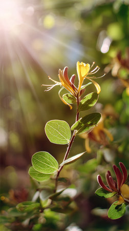 A sunlit portrait of a single Honeysuckle, photographed outdoors on a clear, breezy day. Fresh, crisp air renders vivid detail in the leave veins glowing with gentle backlight. The background falls into a soft natural bokeh of greenery, colors truetolife, organic beauty in pure sunlight.