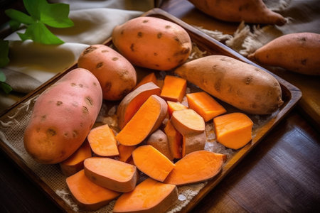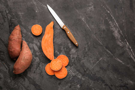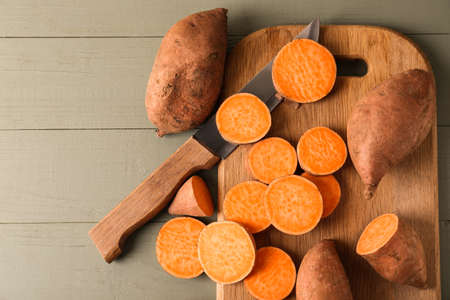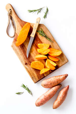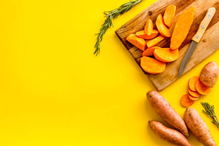 Sweet potato - sliced yams organic vegetables on cutting board, view from above