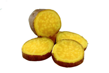 Pile of yellow yam with sliced isolated on a white background with clipping path.