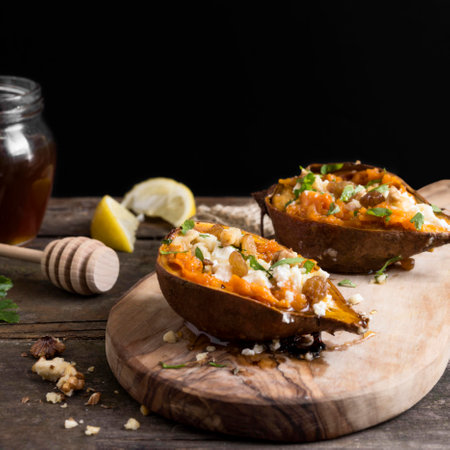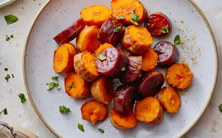 Realistic sweet potatoes inspire cozy atmosphere with warm lighting highly detailed neutral color palette in an extreme closeup view at a restaurant. Generative AI Generated