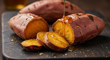 Close-up view of sliced sweet potatoes, cooked and seasoned with honey. The sweet potatoes exhibit a golden-brown color on the cut surfaces, with a reddish-purple exterior. Honey is being poured over the slices, creating a glistening effect. The image is taken indoors, likely on a dark wooden surface, suggesting a culinary or cooking context. This image would be suitable for food blogs, recipe websites, and general food publications.