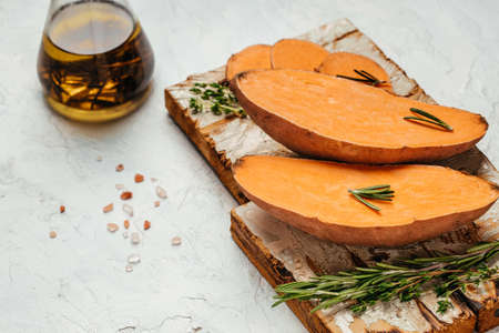 Raw whole orange sweet potato and slices of batatas with fresh rosemary on rustic wooden background, top view, copy space