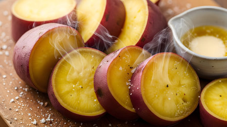 Slices of steaming hot Japanese sweet potatoes, known as Satsumaimo, served on a wooden cutting board with a side of melted butter. The yellow flesh contrasts with the purple skin, appetizingly sprinkled with salt.