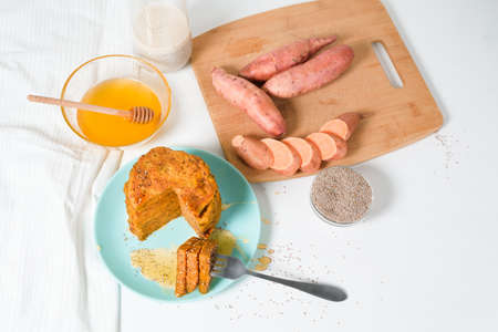 homemade autumn stack vegetarian pancakes with sweet potatoes and Chia seeds, low-calorie Breakfast, taking care of the body. watered with honey on a light background. sliced pancakes.