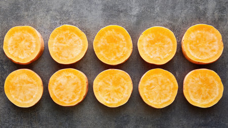 Sliced sweet potato with natural orange flesh, displayed neatly in a row on a plain background, clean and simple.