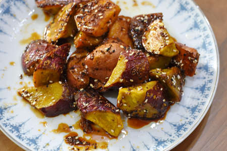 Japanese sweet potato sliced on marble stone. Ready to eat. Potatoes contains a fiber, thiamin, calcium, potassium, and vitamins A and C.