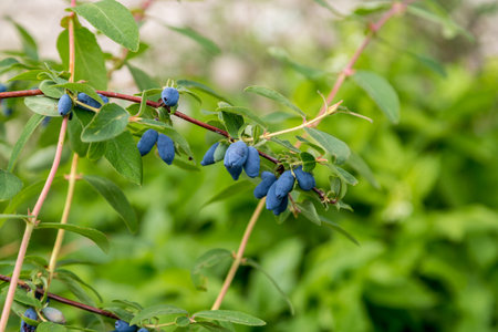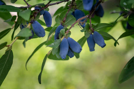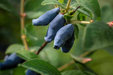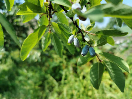 Ripe sweet healthy blue honeysuckle berries or Lonicera caerulea or Haskap on the bush in spring garden. Selective focus