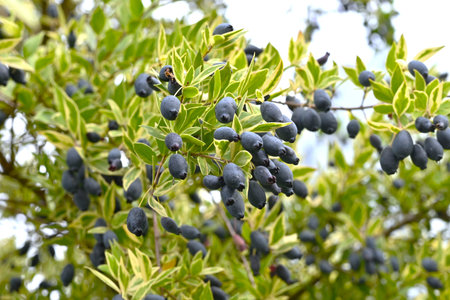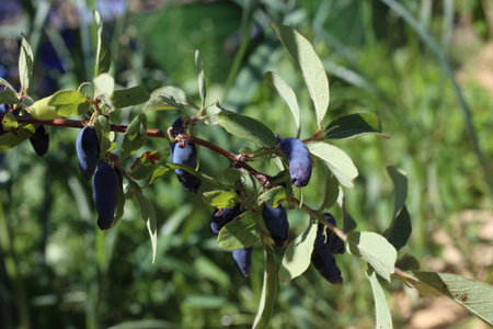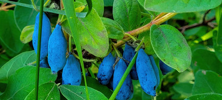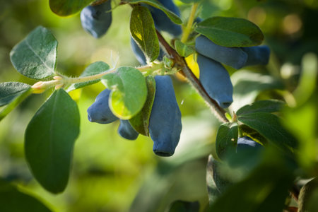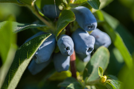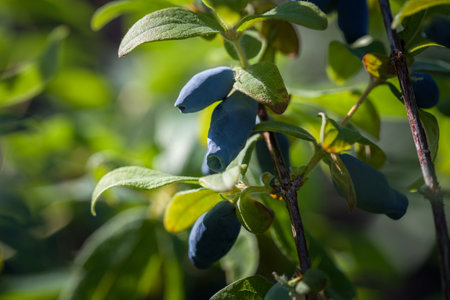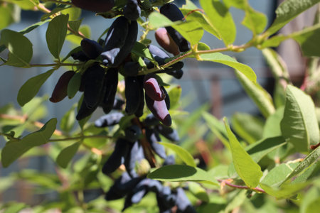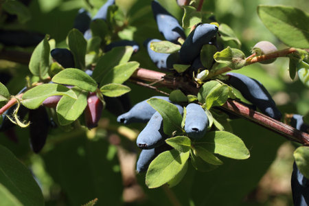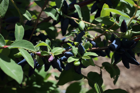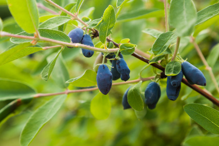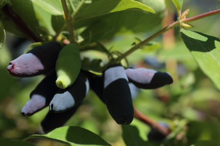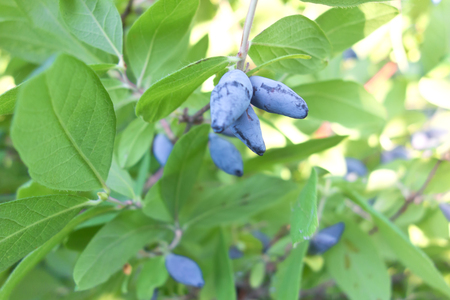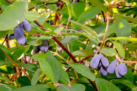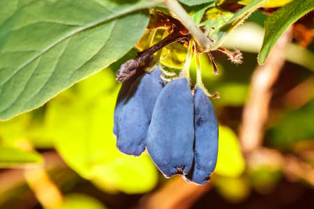 Blue honeysuckle - Haskap berries growing in garden, Lonicera caerulea in the sun