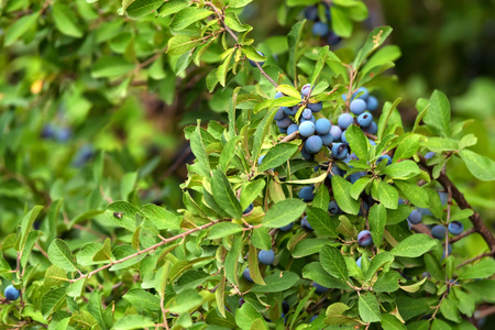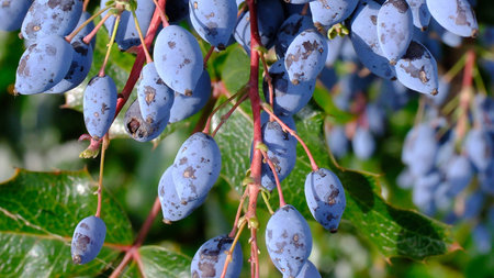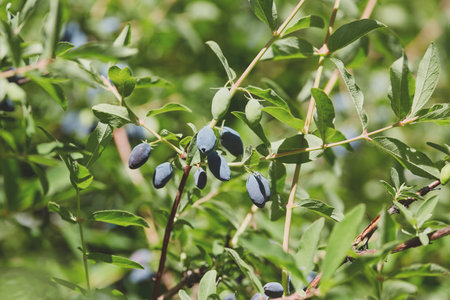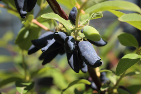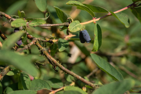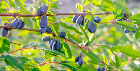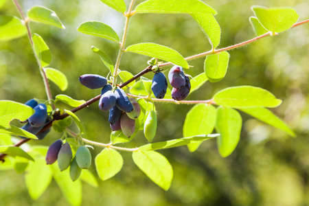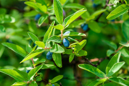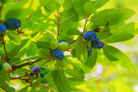 ripe, dark blue Honeysuckle grows on a Bush all in green leaves. and the rays of sunlight