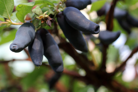 Honneyberry or blue ripe honeysuckle berries on a bush branch with fresh green leaves closeup