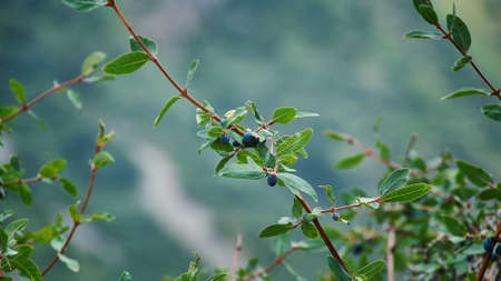 Bush of honeysuckle with fruits. Haskap-bush. Berries on a branch in a forest.