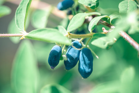 Honeysuckle branch with blue ripe berries. Selective focus.