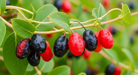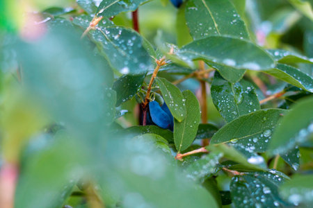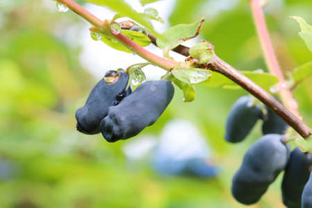 Close up of ripe and juicy honeysuckle berries and water or rain drops on green leaves. Summer or vegetarian background, wild nature concept with green shrub.Latvia