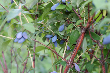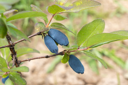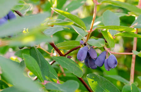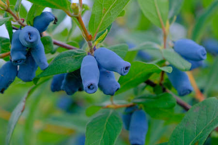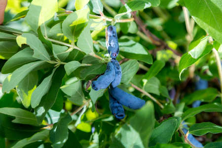Berries on the bush during harvest. Blue Honeysuckle (Lonicera caerulea) - deciduous shrub with edible fruits in a dark blue color.