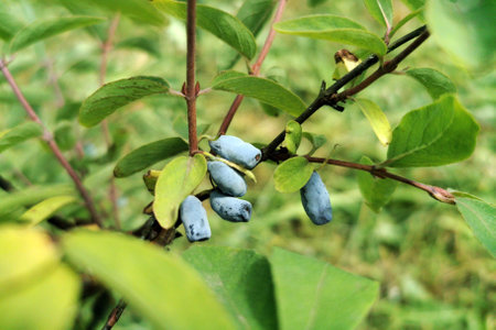 A branch of a honeysuckle bush with blue large berries in close-up in sunny summer weather.