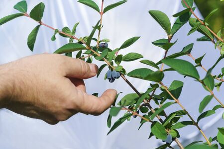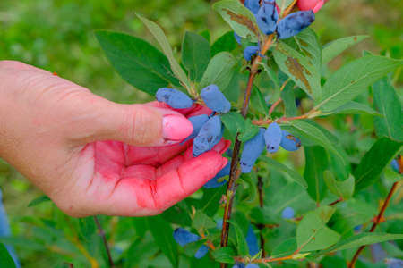 A human hand reaches for a ripe blue berries of edible honeysuckle on a branch. The harvest