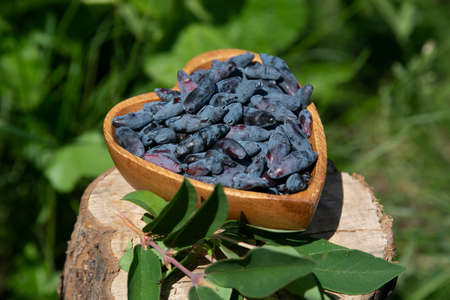 black and blue honeysuckle berries in a wooden plate on a background of green grass