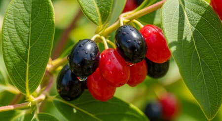 Close-up of ripe blue honeysuckle berries and unripe green ones hanging on branches with vibrant green leaves, captured in a natural outdoor environment under sunlight.