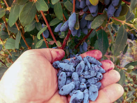 Berry in hand. Harvesting of honeysuckle berry in the garden.