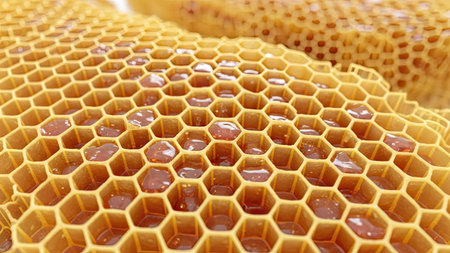 Exploring the intricate texture of honeycomb and golden honey in hexagonal formations