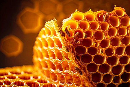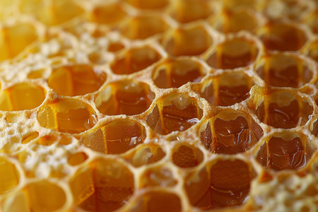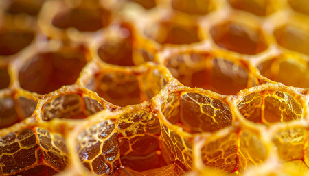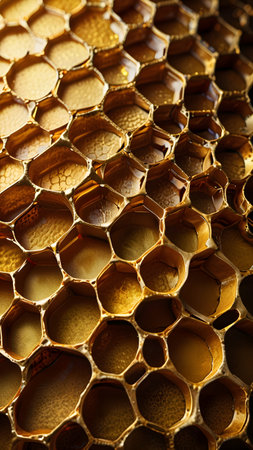 A stunning close-up of a honeycomb structure showcasing intricate hexagonal patterns and rich golden hues, embodying nature's beauty and harmony.
