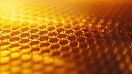 A macro view of a honeycomb revealing its perfect hexagonal structure. Golden hues and subtle textures create a visually rich abstract pattern evoking nature's sweet bounty and organized design.